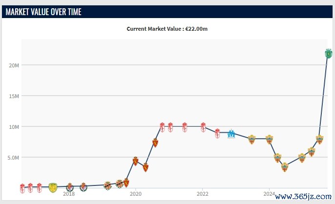此前球员身价为800万欧,如今身价暴涨了1400万欧,涨至2200万欧。