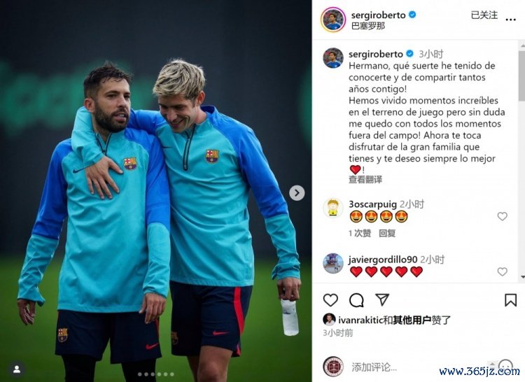 10月8日讯 西班牙边卫阿尔巴将在本赛季截至后退役,前巴萨队友罗贝托社媒发文祝颂。