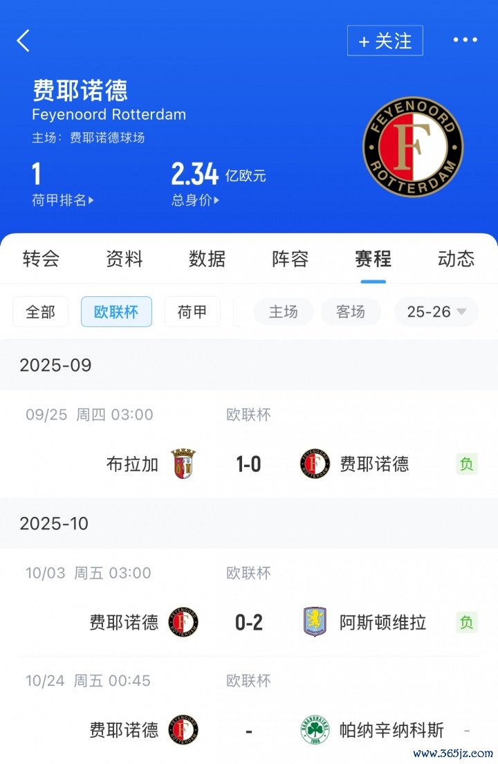 而在欧联赛场,费耶诺德际遇了两连败,0-1输给葡超布拉加,0-2不敌阿斯顿维拉。欧战开局2场0进球,亦然费耶诺德队史最差记载。