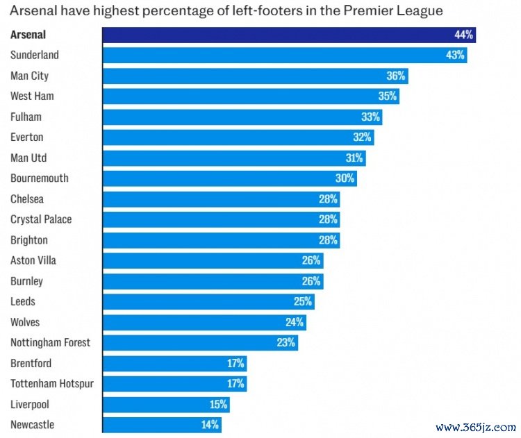 据《电讯报》统计,阿尔特塔治下引进的30名非门将球员中,高达13东说念主43%是左脚将,远超欧洲主流联赛27%的平均水平。现时,阿森纳一线队气势中左脚球员占比更是达到惊东说念主的44%,多于升班马桑德兰的42%。