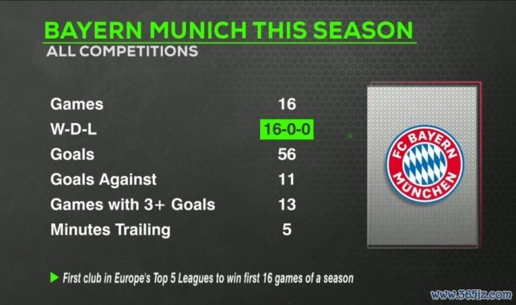 数据统计贯通,拜仁在本赛季各项赛事16战保抓全胜,打进56球、丢11球。有13场比赛大致至少打进3球,本赛季策划仅有5分钟处于过期。