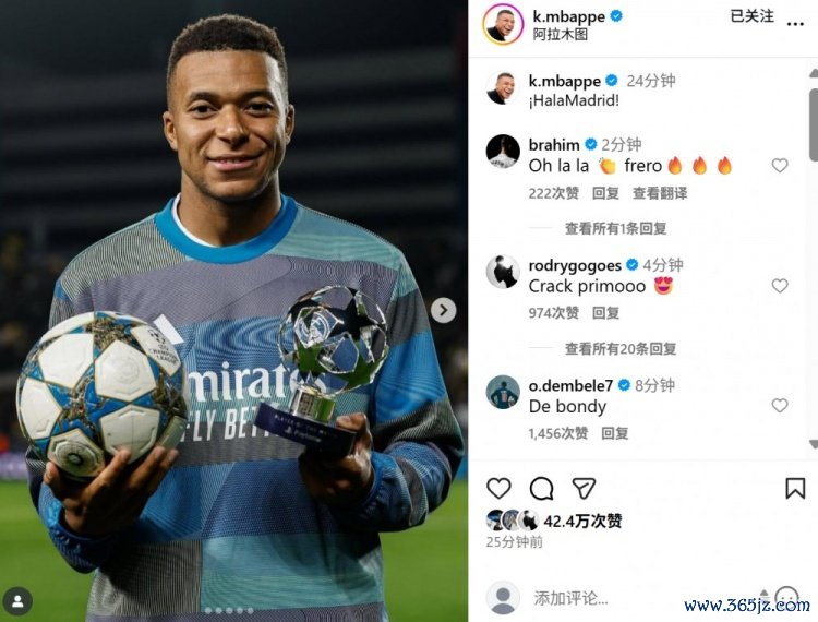 献艺帽子戏法,姆巴佩社媒晒与全场最好奖杯、比赛用球合影