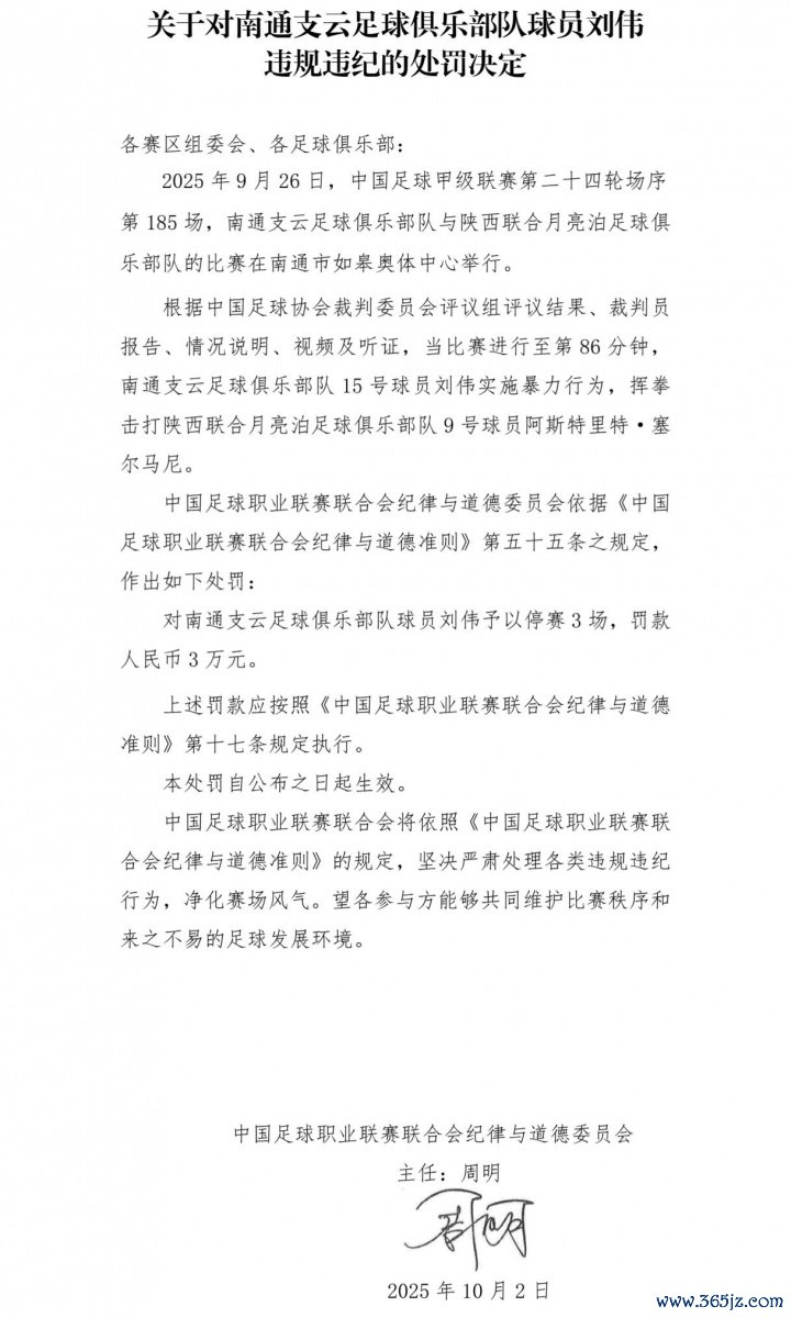 10月02日讯 中足联今天发布惩处决定,左证最新一期裁判评议效果,决定对南通支云球员刘伟停赛3场,罚金3万元。
