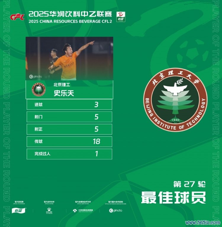 官方:3粒进球助推北理工5球大捷,史乐天当选中乙第27轮最好球员