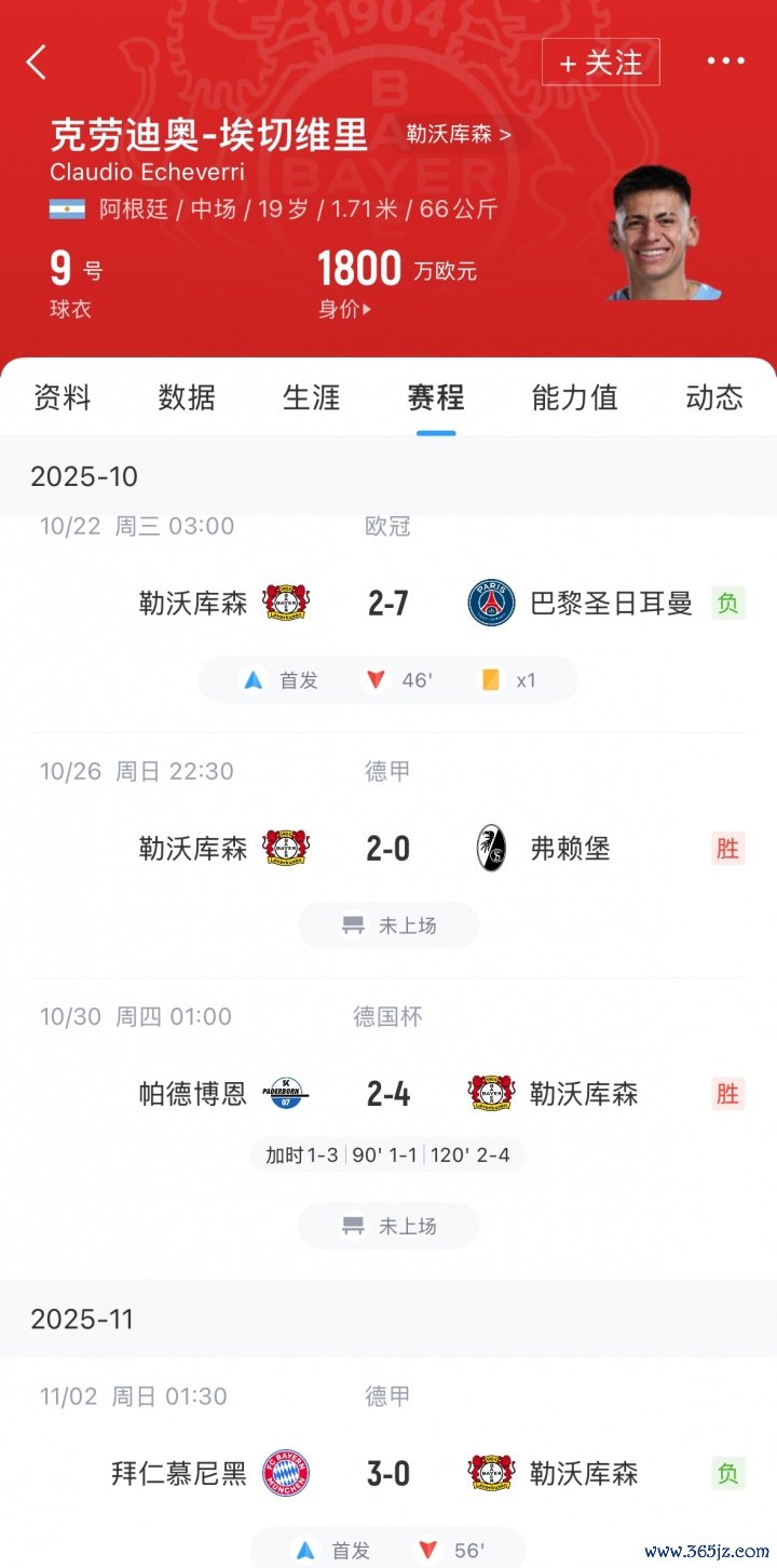 埃切维里从曼城租出至勒沃库森后,现在出战7场比赛,出场技能183分钟送出1次助攻。靠近巴黎和拜仁埃切维里均首发,而德甲靠近弗赖堡和德国杯对阵帕德博恩,埃切维里王人没能取得出场契机。