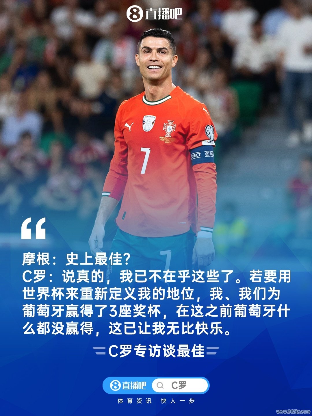 C罗:是的,但这不是合手念。我不得意(宇宙杯界说球员),因为葡萄牙从未获得过宇宙杯冠军,咱们会为之激越。用这个来评判我14岁到41岁的总共这个词糊口?去评判什么?用一届比赛评判我是否是史上最好之一?用六、七场比赛?你觉得这刚正吗?这不刚正。
