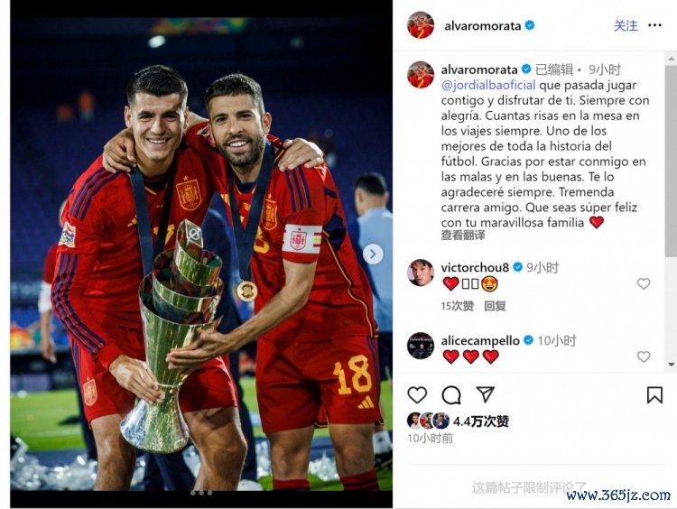 10月8日讯 阿尔巴晓喻将在本赛季鸿沟后退役,曾在西班牙队与他同事的莫拉塔社媒发文致意。