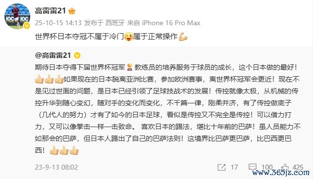 高雷雷转发了我方两年前谈日本足球的言论,并写谈:“天下杯日本夺冠不属于冷门,属于平素操作💪”