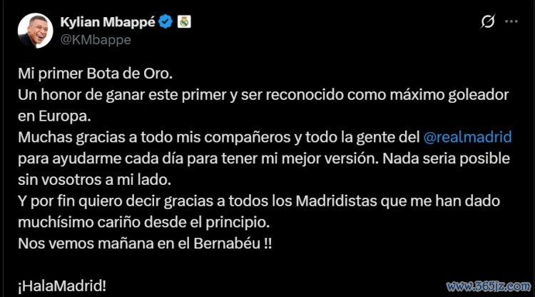 荣获欧洲金靴!姆巴佩社媒:感谢队友、皇马的每一个东谈主和皇马球迷