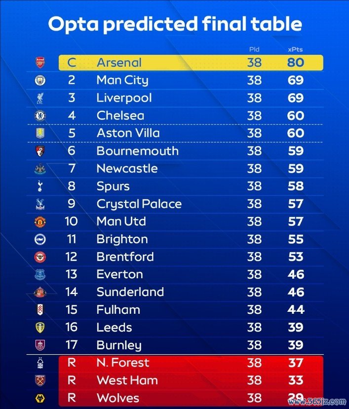 OPTA权衡英超最终名次:阿森纳80分夺冠,曼城赤军69分,曼联第10