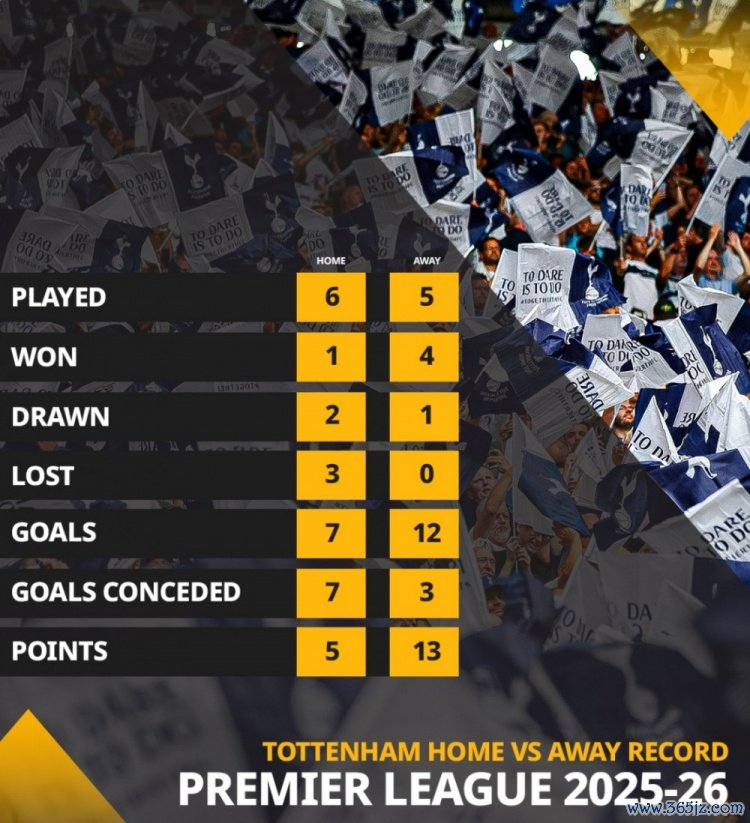 11月23日讯 北京手艺翌日凌晨,热刺将在英超第12轮比赛中客场对阵阿森纳。Opta统计了热刺本赛季英超主客场的数据,并作念出对比,热刺客场拿到13分英超最多,但主场只拿5分。