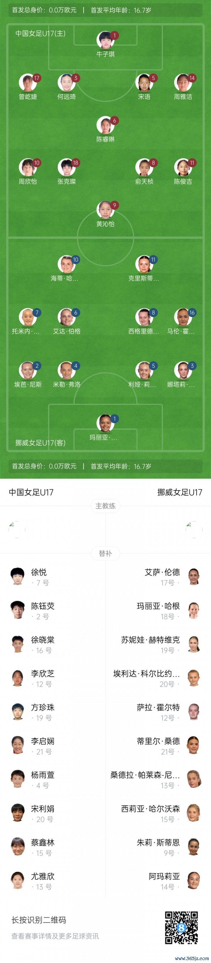 挪威U17女足首发:1-玛丽亚·埃莉斯·克罗肯、2-埃巴·尼斯、3-娜塔莉·斯凯德、4-米勒·弗洛、5-莉娅·埃林森、6-艾达·伯格、7-托米娜·恩格尔、8-西格丽德·加姆斯特、16-马伦·富格拉斯、10-海蒂·哈尔布迈尔、11-克里斯蒂娜·赫尔塞特