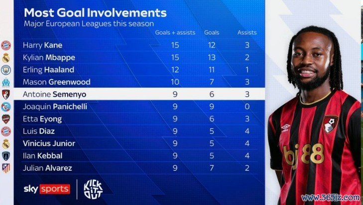 11月2日讯 天外体育盘货了本赛季欧洲主流联赛球员参与进球榜(进球+助攻),以下为具体榜单(只统计联赛):
