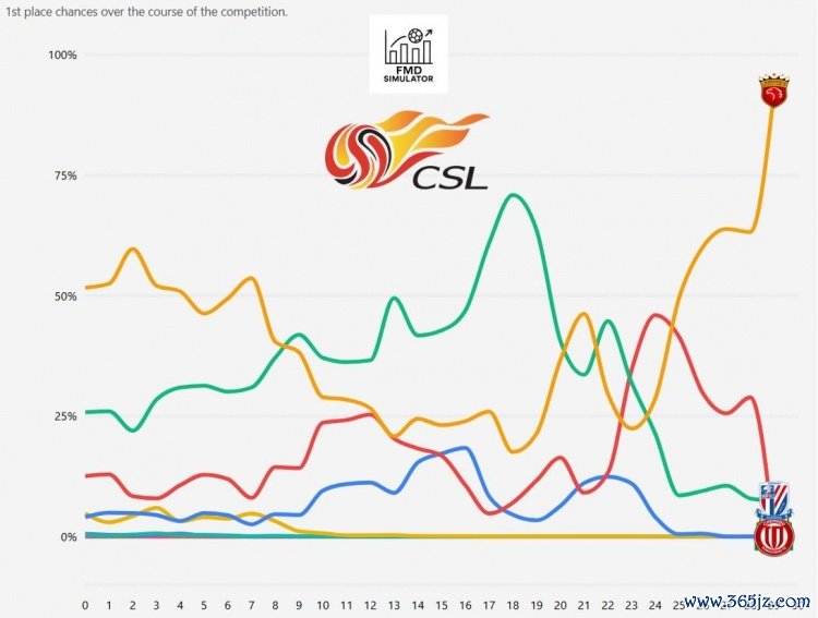 收官战运行前,数据平台“footballmeetsdata”在推特上列出了中超争冠球队的夺冠概率走势,其中: