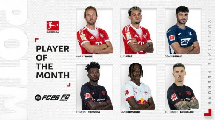 转播吧3月4日讯德甲官方公布足球比赛2月最佳选手候选,凯恩、路易斯·迪亚斯、扬·迪奥曼德等6名选手在列。