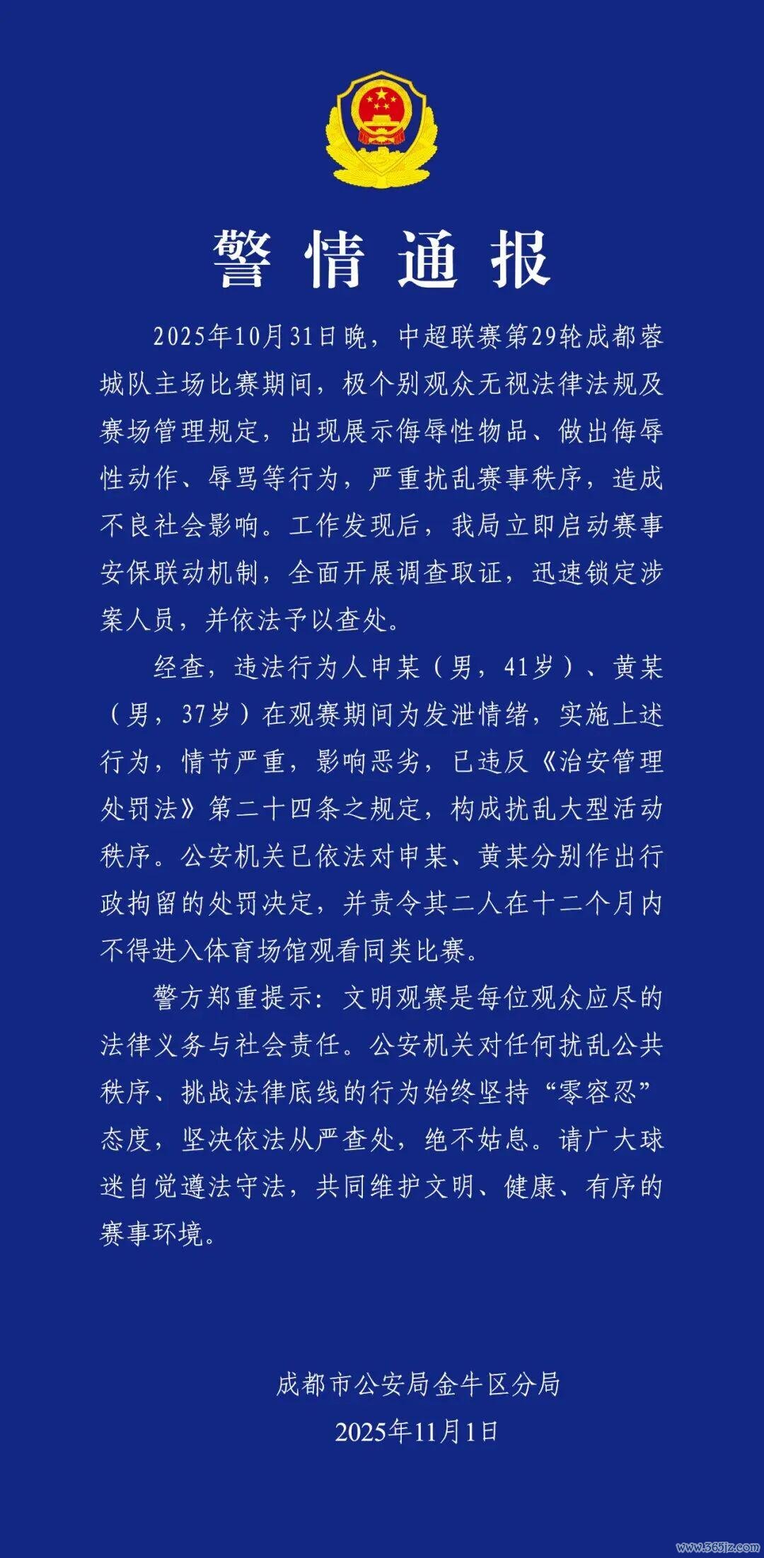 2025年10月31日晚,中超联赛第29轮成齐蓉城队主场比赛本事,极个别不雅众无视法律法例及赛场科罚功令,出现展示侮辱性物品、作念出侮辱性看成、横蛮等行动,严重颓唐赛事纪律,形成不良社会影响。职责发现后,我局立即入手赛事安保联动机制,全面开展走访取证,速即锁定涉案东谈主员,并照章给予查处。