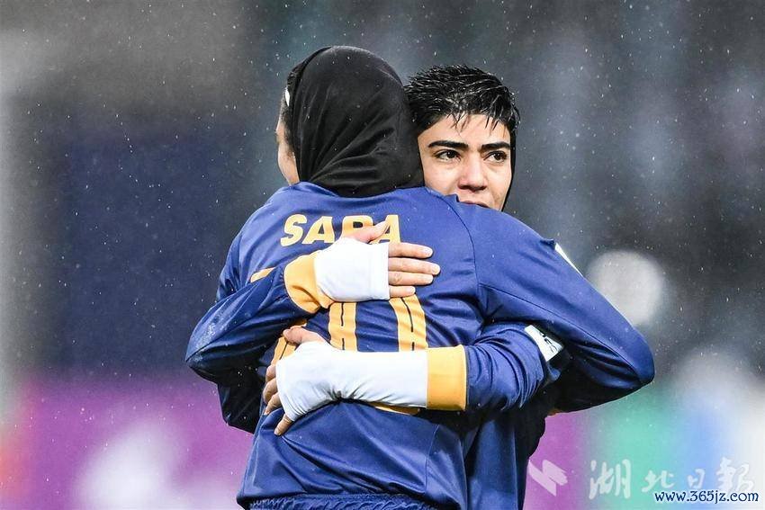 11月17日下昼,巴姆卡通女足(伊朗)队员哈穆迪罚进点球后与队友拥抱庆祝。(湖北日报全媒记者任勇摄)