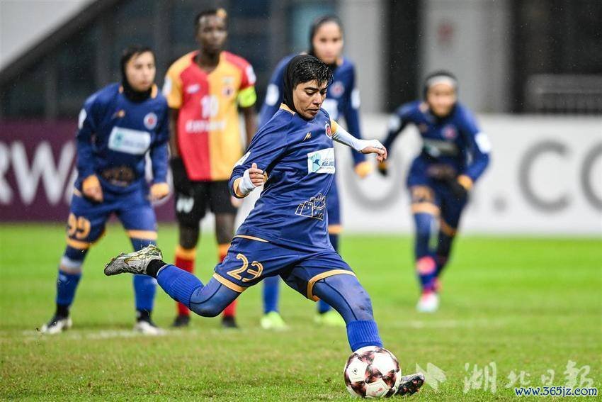 11月17日下昼,巴姆卡通女足(伊朗)队员哈穆迪在比赛中罚射点球。(湖北日报全媒记者任勇摄)